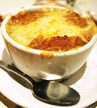 Garnir une soupière allant au four de couches alternées de pain grillé et de fromage, en terminant par une couche de fromage.